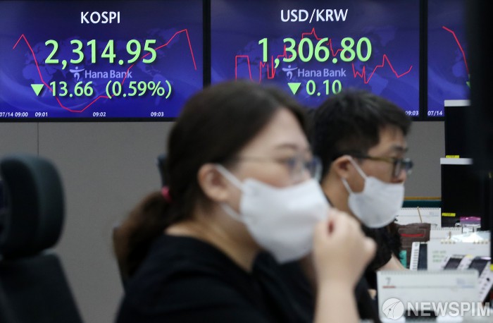 [서울=뉴스핌] 정일구 기자 = 14일 코스피 지수가 전 거래일보다 12.20포인트(0.52%) 하락한 2316.41에 출발했다. 코스닥 지수는 전 거래일 대비 0.64포인트(0.08%) 내린 762.54에 시작했다. 원·달러 환율은 전 거래일보다 0.4원 하락한 1306.5에에 장을 열었다. 이날 오전 서울 중구 하나은행 딜링룸에서 딜러들이 업무를 보고 있다. 2022.07.14 mironj19@newspim.com