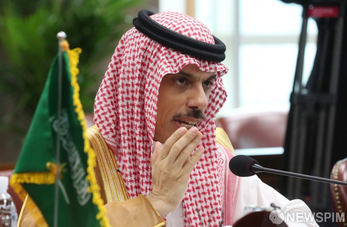 [서울=뉴스핌] 김학선 기자 = 파이살 빈 파르한 알 사우드 사우디아라비아 외교부 장관이 20일 서울 종로구 외교부 청사에서 열린 한-사우디 외교장관회담에서 발언하고 있다. 2022.07.20 yooksa@newspim.com