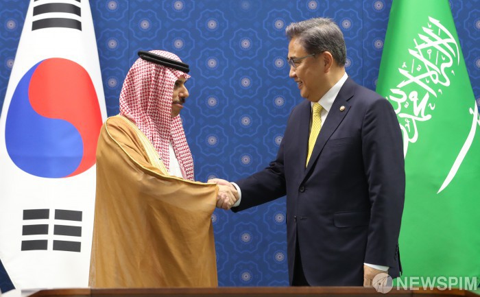 [서울=뉴스핌] 김학선 기자 = 박진 외교부 장관과 파이살 빈 파르한 알 사우드 사우디아라비아 외교부 장관이 20일 서울 종로구 외교부 청사에서 열린 한-사우디 외교장관회담에 앞서 인사를 나누고 있다. 2022.07.20 yooksa@newspim.com
