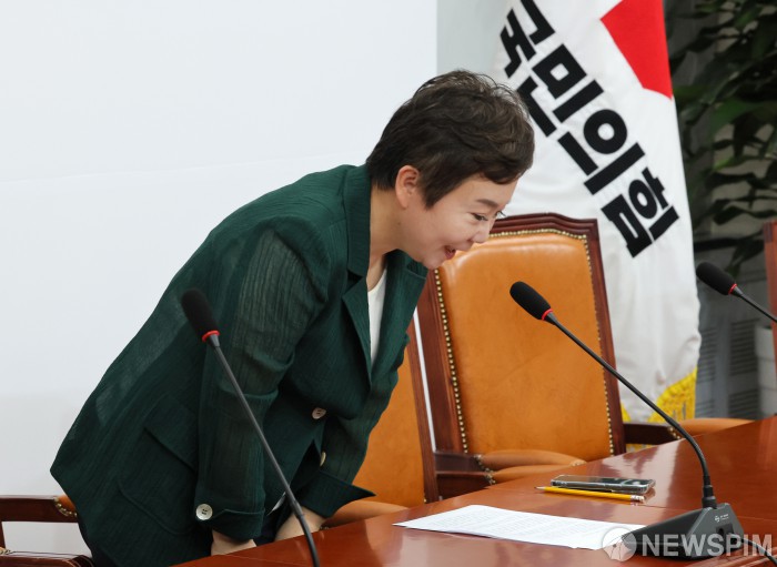 [서울=뉴스핌] 최상수 기자 = 국민의힘 정미경 최고위원이 8일 오전 국회 국민의힘 대회의실에서 최고위원 사퇴 기자회견을 하기에 앞서 인사하고 있다. (공동취재사진) 2022.08.08 photo@newspim.com