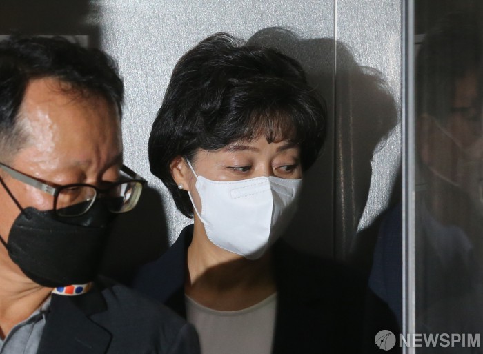 [서울=뉴스핌] 황준선 기자 = 만5세 초등 취학 정책으로 논란을 빚었던 박순애 사회부총리 겸 교육부 장관이 8일 오후 서울 여의도 한국교육시설안전원에서 사퇴 기자회견을 마치고 엘레베이터에 탑승하고 있다. 2022.08.08 hwang@newspim.com