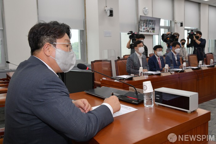 [서울=뉴스핌] 김민지 기자 = 권성동 국민의힘 당대표 직무대행 겸 원내대표가 9일 오후 서울 여의도 국회에서 열린 화상의원총회에 앞서 의원들과 대화를 하고 있다. (공동취재사진) 2022.08.09 photo@newspim.com