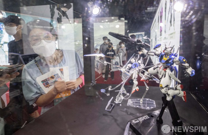 [서울=뉴스핌] 윤창빈 기자 = 11일 오후 서울 강남구 코엑스에서 열린 반다이남코코리아 펀 엑스포에서 관람객들이 프라모델을 관람하고 있다. 2022.08.11 pangbin@newspim.com