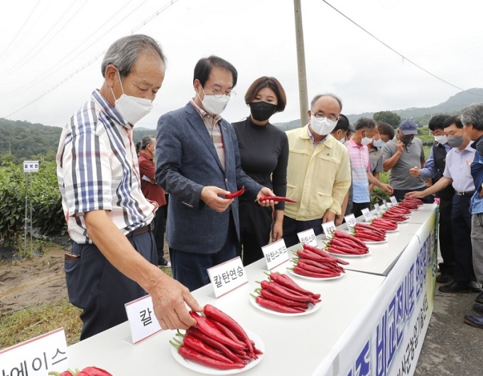 | 17일 송인헌 괴산군수가 고추 품종 비교전시 현장을 방문해 관계자로부터 다양한 품종에 대한 설명을 듣고 있다. [사진=괴산군] 2022.08.17 baek3413@newspim.com |