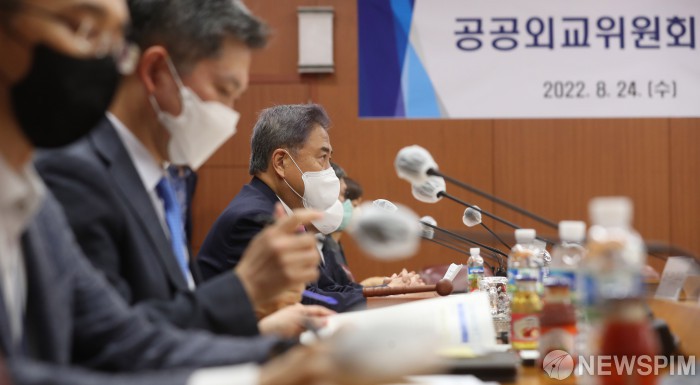 [서울=뉴스핌] 김학선 기자 = 박진 외교부 장관이 24일 서울 종로구 정부서울청사에서 열린 공공외교위원회 제6차 회의에 참석해 발언하고 있다. 2022.08.24 yooksa@newspim.com