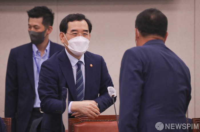 [서울=뉴스핌] 최상수 기자 = 이창양 산업통상자원부 장관이 29일 서울 여의도 국회에서 열린 산업통상자원중소벤처기업위원회 전체회의에서 의원들과 인사하고 있다. (공동취재사진) 2022.08.29 photo@newspim.com