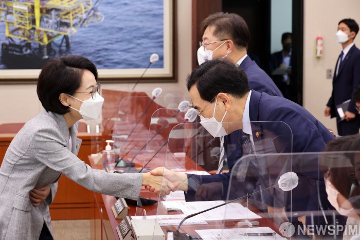 [서울=뉴스핌] 최상수 기자 = 산업통상자원중소벤처기업위원회 전체회의가 29일 서울 여의도 국회에서 열린 가운데 이창양 산업통상자원부 장관(오른쪽)이 더불어민주당 홍정민 의원과 인사하고 있다. (공동취재사진) 2022.08.29 photo@newspim.com