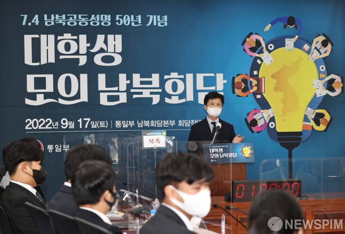 [서울=뉴스핌] 최상수 기자 = 이상민 통일부 남북회담본부장이 17일 서울 종로구 통일부 남북회담본부에서 열린 7.4 남북공동성명 50년 기념 대학생 모의 남북회담에서 인사말을 하고 있다. 2022.09.17 kilroy023@newspim.com