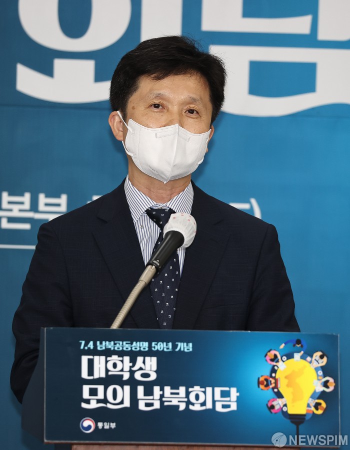 [서울=뉴스핌] 최상수 기자 = 이상민 통일부 남북회담본부장이 17일 서울 종로구 통일부 남북회담본부에서 열린 7.4 남북공동성명 50년 기념 대학생 모의 남북회담에서 인사말을 하고 있다. 2022.09.17 kilroy023@newspim.com