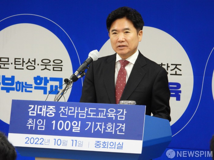 [무안=뉴스핌] 김대중 전남도교육감이 11일 오전 도교육청 중회의실에서 취임 100일 기자회견을 열고 취채진 질문에 답하고 있다. 2022.10.11 dw2347@newspim.com