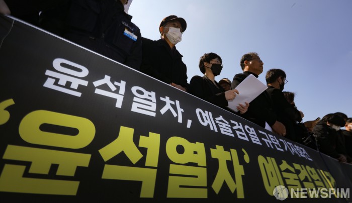 [서울=뉴스핌] 황준선 기자 = 11일 오전 서울 용산구 대통령 집무실 앞에서 문화민주주의실천연대와 우리만화연대 등 문화예술 단체원들이 '윤석열차', 예술검열 규탄 기자회견을 하고 있다. 2022.10.11 hwang@newspim.com