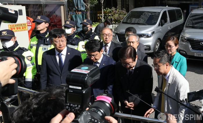 [서울=뉴스핌] 황준선 기자 = 이재명 더불어민주당 대표가 24일 오전 검찰 압수수색이 진행중인 서울 여의도 더불어민주당 당사 앞에서 입장을 밝히고 있다. 2022.10.24 hwang@newspim.com