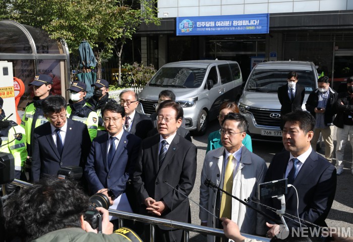 [서울=뉴스핌] 황준선 기자 = 이재명 더불어민주당 대표가 24일 오전 검찰 압수수색이 진행중인 서울 여의도 더불어민주당 당사 앞에서 입장을 밝히고 있다. 2022.10.24 hwang@newspim.com
