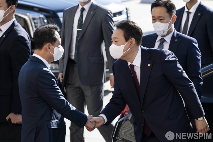 [서울=뉴스핌] 윤창빈 기자 = 2023년도 본예산안 시정연설을 위해 국회에 도착한 윤석열 대통령이 25일 이광재 국회 사무총장의 영접을 받고 있다. 2022.10.25 pangbin@newspim.com
