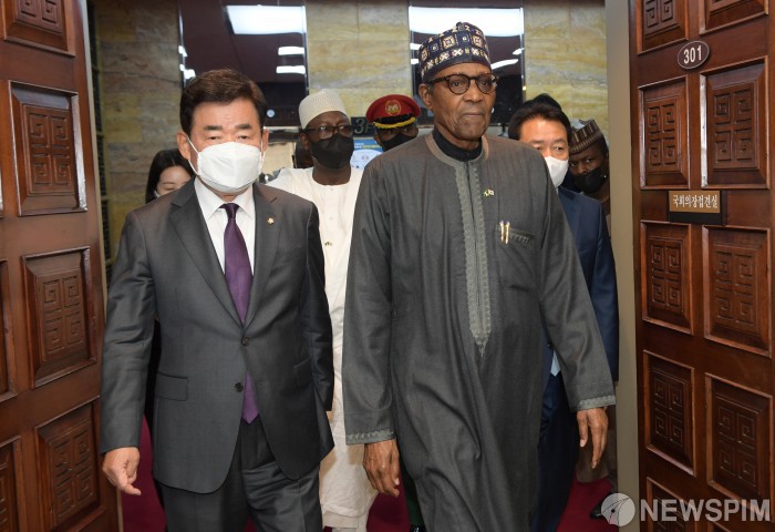 무함마두 부하리 나이지리아 대통령 맞이하는 김진표 국회의장