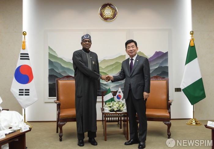 악수하는 김진표 국회의장 - 무함마두 부하리 나이지리아 대통령