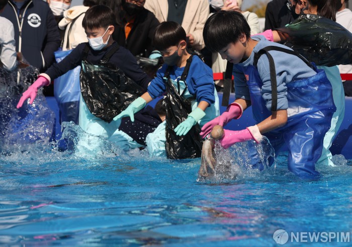 [서울=뉴스핌] 황준선 기자 = 29일 오후 서울 동작구 노량진 수산시장에서 열린 수산대축제에서 어린이들이 맨손 활어잡기 체험을 하고 있다. 2022.10.29 hwang@newspim.com