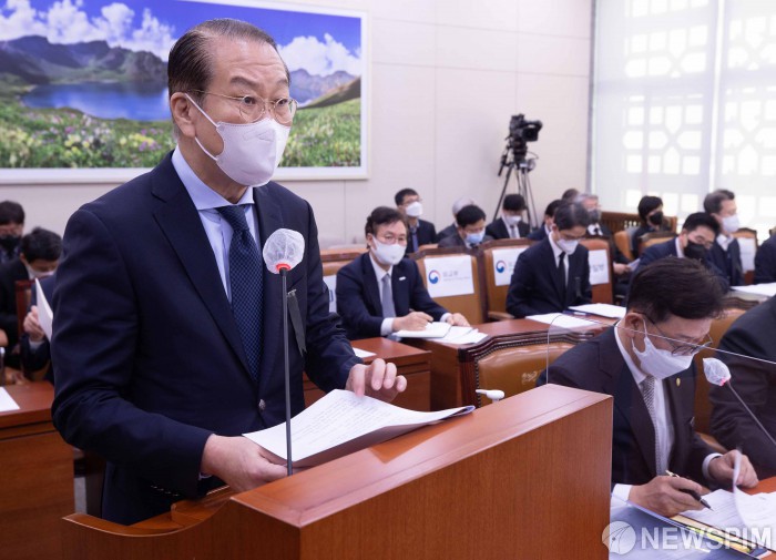 [서울=뉴스핌] 윤창빈 기자 = 권영세 통일부 장관이 31일 오전 서울 여의도 국회에서 열린 외교통일위원회에서 예산안 관련 제안설명을 하고 있다. 2022.10.31 pangbin@newspim.com