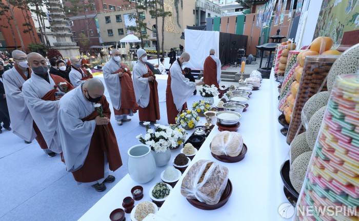 [서울=뉴스핌] 황준선 기자 = 4일 오후 서울 종로구 조계사에서 열린 이태원 참사 희생영가 추모 위령법회에서 스님들이 희생자들을 추모하고 있다. 2022.11.04 hwang@newspim.com
