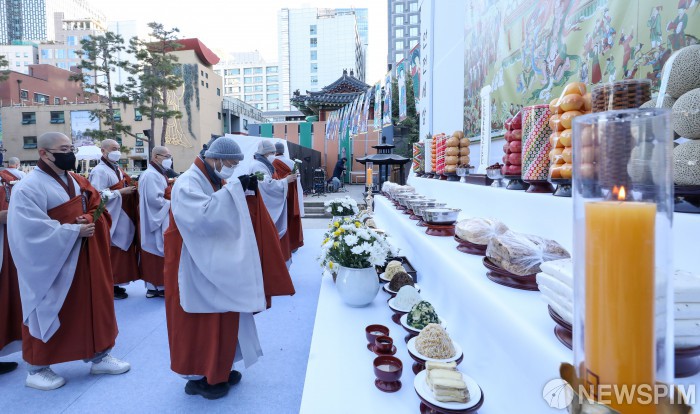 [서울=뉴스핌] 황준선 기자 = 4일 오후 서울 종로구 조계사에서 열린 이태원 참사 희생영가 추모 위령법회에서 스님들이 희생자들을 추모하고 있다. 2022.11.04 hwang@newspim.com