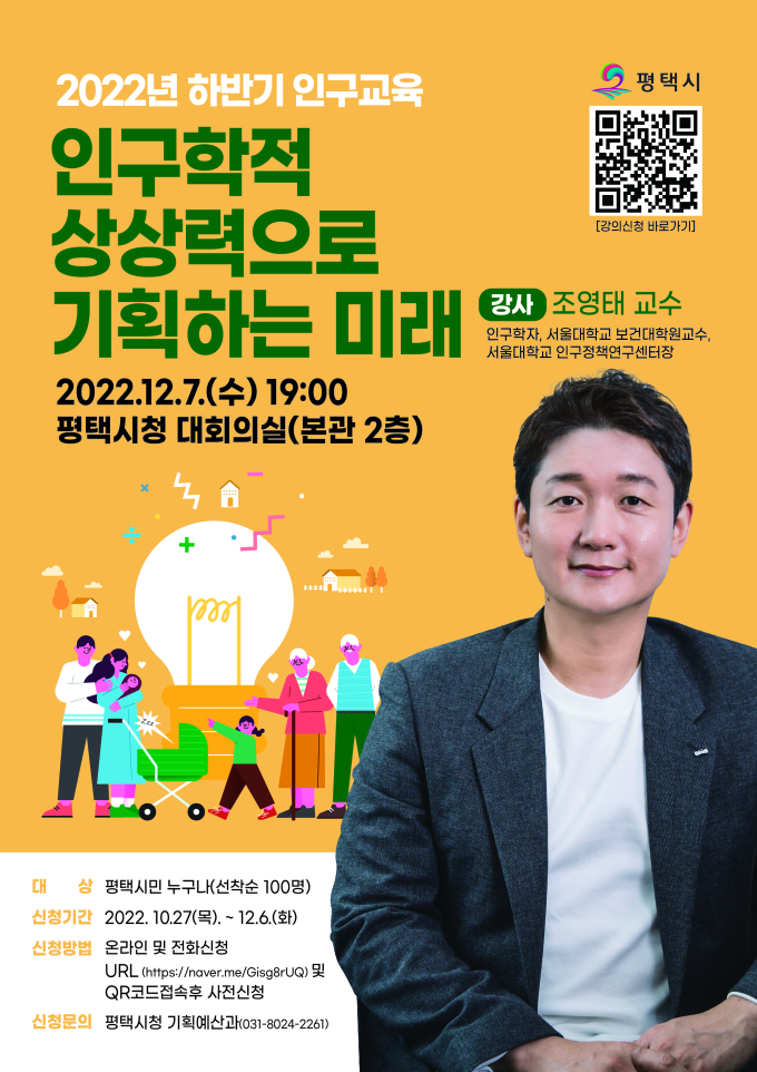 강연은 서울대 보건대학원 조영태 교수가 초빙돼 진행되며, 강연은 평택시민이면 누구나 참여 할 수 있다.