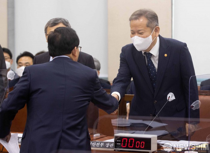 [서울=뉴스핌] 윤창빈 기자 = 이상민 행정안전부 장관이 17일 오후 서울 여의도 국회에서 열린 제400회국회(정기회) 제11차 행정안전위원회 전체회의에서 이채익 국회 행정안전위원장과 인사를 나누고 있다. 2022.11.17 pangbin@newspim.com