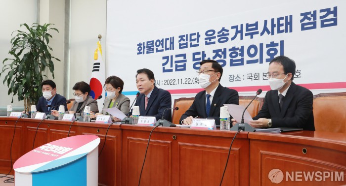 [서울=뉴스핌] 이형석 기자 = 성일종 국민의힘 정책위의장이 22일 오전 서울 여의도 국회에서 열린 화물연대 집단 운송거부사태 점검 긴급 당정협의회에서 발언을 하고 있다. 2022.11.22 leehs@newspim.com