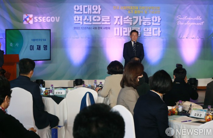 [서울=뉴스핌] 이형석 기자 = 이재명 더불어민주당 대표가 7일 서울 여의도 국회 사랑재에서 열린 전국 사회연대경제 지방정부협의회 2022 출범식에서 축사를 하고 있다. 2022.12.07 leehs@newspim.com
