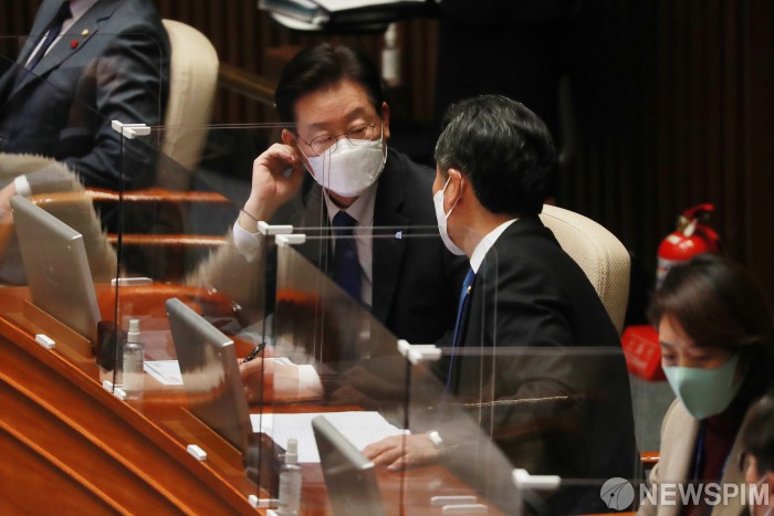 [서울=뉴스핌] 이형석 기자 = 이재명 더불어민주당 대표가 8일 서울 여의도 국회에서 열린 제400회 국회(정기회) 제14차 본회의에서 대화를 나누고 있다. 2022.12.08 leehs@newspim.com