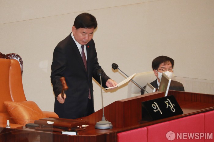 [서울=뉴스핌] 이형석 기자 = 김진표 국회의장이 8일 서울 여의도 국회에서 열린 제400회 국회(정기회) 제14차 본회의에서 의사봉을 두드리고 있다. 2022.12.08 leehs@newspim.com