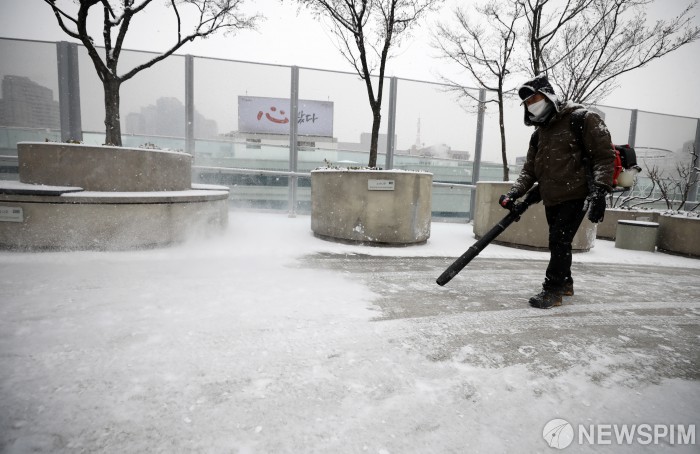 [서울=뉴스핌] 정일구 기자 = 서울을 비롯한 중부 지방에 대설주의보가 발효된 15일 오후 서울 중구 서울로 7017에서 관계자가 제설작업을 하고 있다. 2022.12.15 mironj19@newspim.com
