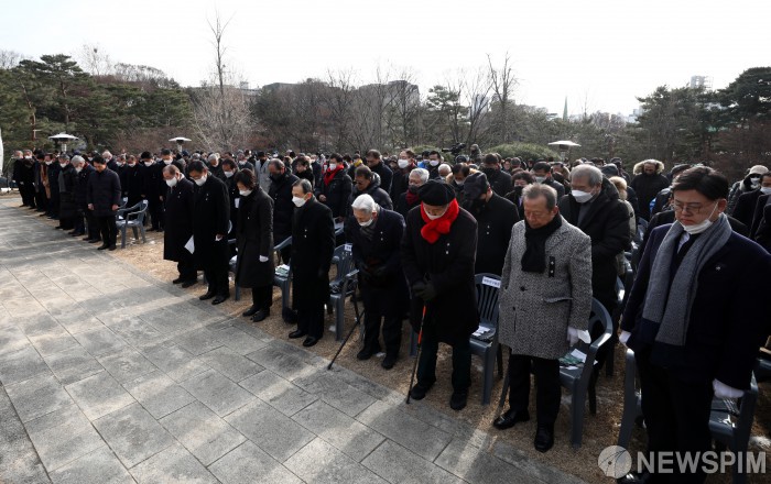 [서울=뉴스핌] 정일구 기자 = 19일 오전 서울 용산구 효창공원에서 열린 매헌 윤봉길 의사 순국 제90주기 추념식에서 참석자들이 순국선열 및 호국영령에 대한 묵념을 하고 있다. 2022.12.19 mironj19@newspim.com