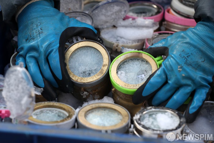 [서울=뉴스핌] 정일구 기자 = 수도권을 중심으로 한 대설과 한파로 계량기 동파 피해가 잇따르고 있는 가운데 22일 오후 서울 종로구 중부수도사업소 효자가압장에서 관계자가 동파된 수도계량기를 정리하고 있다. 2022.12.22 mironj19@newspim.com