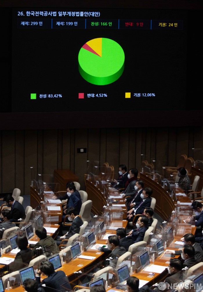 [서울=뉴스핌] 윤창빈 기자 = 28일 오후 서울 여의도 국회 본회의에서 한국전력공사법 일부개정법률안이 가결되고 있다. 2022.12.28 pangbin@newspim.com