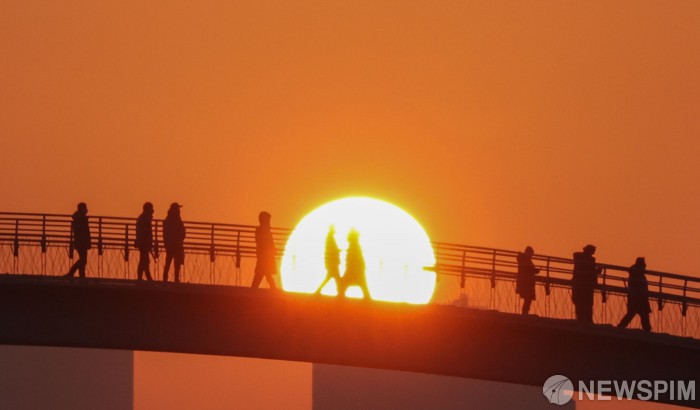 [서울=뉴스핌] 황준선 기자 = 2023년 계묘년 새해 첫 날인 1일 오전 서울 영등포구 선유도공원을 찾은 시민들이 일출을 바라보고 있다. 2023.01.01 hwang@newspim.com