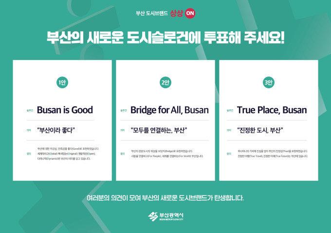 부산의 새로운 얼굴이 될 도시 슬로건 최종후보는 ▲Busan is Good(부산이라 좋다) ▲Bridge for All, Busan(모두를 연결하는, 부산) ▲True Place, Busan(진정한 도시, 부산)이다.