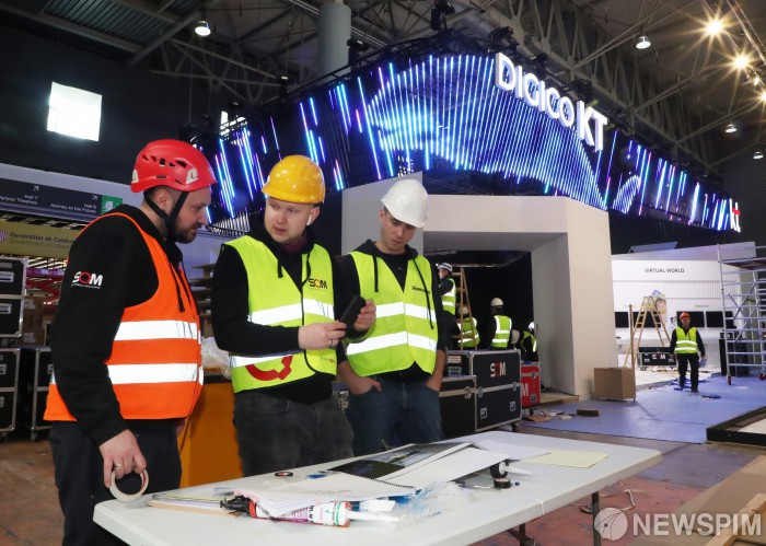 [바르셀로나(스페인)=뉴스핌] 사진공동취재단 = 24일(현지시간) 스페인 바르셀로나 피라 그란 비아 전시장에서 KT 관계자들이 ‘모바일 월드 콩그레스(MWC 2023)’ 부스 설치 작업을 하고 있다. 세계 최대 모바일 기술 박람회인 MWC는 오는 27일 개막해 다음달 2일까지 나흘간 열린다. 2023.02.25 photo@newspim.com