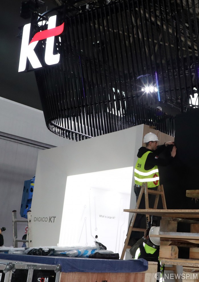 [바르셀로나(스페인)=뉴스핌] 사진공동취재단 = 24일(현지시간) 스페인 바르셀로나 피라 그란 비아 전시장에서 KT 관계자들이 ‘모바일 월드 콩그레스(MWC 2023)’ 부스 설치 작업을 하고 있다. 세계 최대 모바일 기술 박람회인 MWC는 오는 27일 개막해 다음달 2일까지 나흘간 열린다. 2023.02.25 photo@newspim.com