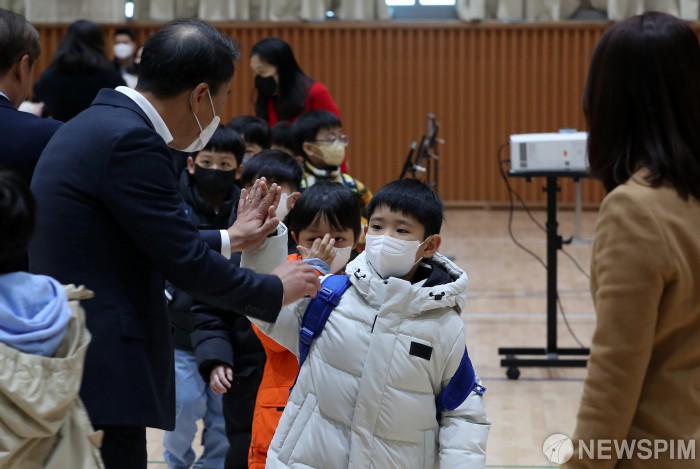 [서울=뉴스핌] 정일구 기자 = 2일 오전 서울 강동구 강빛초등학교에서 1학년 신입생들이 입학식에 참석해 선생님들과 인사를 하고 있다. 이날 전국 초·중·고교가 2019년 이후 4년 만에 실내 마스크 착용 의무 없이 대면 입학식을 치르고 새 학기를 시작했다. 2023.03.02 mironj19@newspim.com