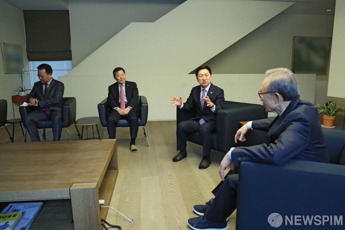 [서울=뉴스핌] 김기현 국민의힘 대표(왼쪽 세번째)가 15일 오후 서울 강남구 이명박 전 대통령의 자택을 찾아 이 전 대통령과 대화를 나누고 있다. [사진=국민의힘] 2023.03.15 photo@newspim.com]