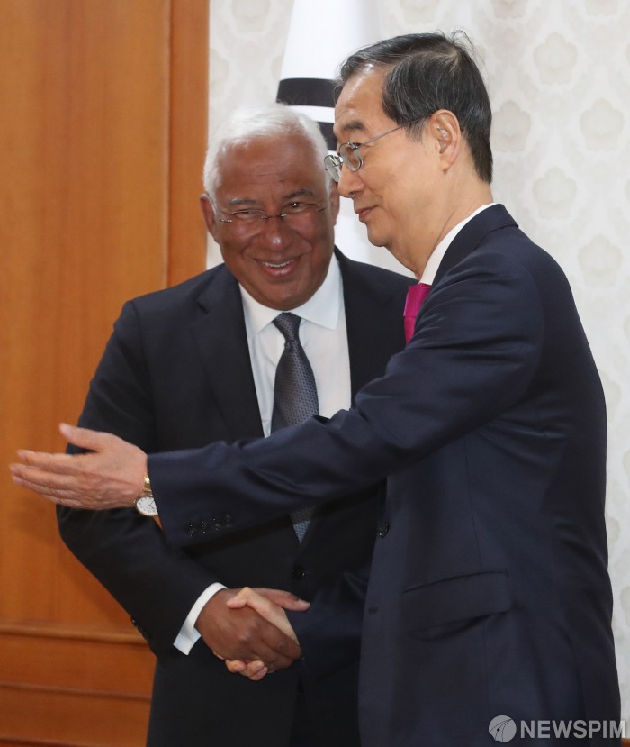 [서울=뉴스핌] 김학선 기자 = 한덕수 국무총리와 안토니우 코스타 포르투갈 총리가 12일 오전 서울 종로구 정부서울청사에서 열린 한-포르투갈 총리 회담에 앞서 악수하고 있다. 2023.04.12 yooksa@newspim.com