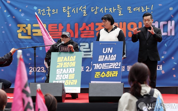 [서울=뉴스핌] 정일구 기자 = 김진수, 박경인 전국탈시설장애인연대 공동준비위원장이 13일 오후 서울 중구 서울시청 인근에서 열린 전국탈시설장애인연대 창립대회에서 인사말을 하고 있다. 2023.04.13 mironj19@newspim.com