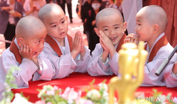 [서울=뉴스핌] 김학선 기자 = 불기 2567년 부처님오신날을 앞두고 11일 서울 종로구 조계사에서 열린 관불의식 입재식에 삭발 수계식을 한 동자승들이 참석해 있다. 2023.05.11 yooksa@newspim.com