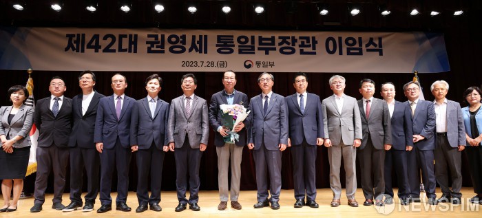 [서울=뉴스핌] 김학선 기자 = 권영세 통일부 장관이 28일 정부서울청사 별관에서 열린 이임식에서 통일부 간부들과 기념촬영을 하고 있다. 2023.07.28 yooksa@newspim.com