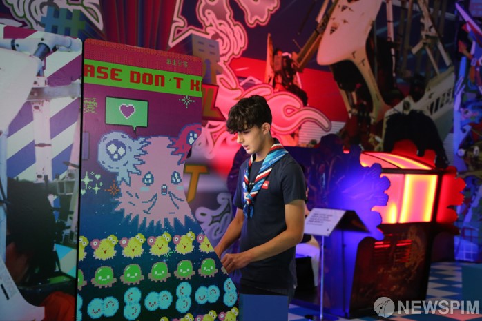 [서울=뉴스핌] 이현경 기자 = 잼버리 참가자가 8일 국립현대미술관을 방문해 전시 '게임사회'를 둘러보며 직접 체험하고 있다. [사진=국립현대미술관] 2023.08.08 89hklee@newspim.com