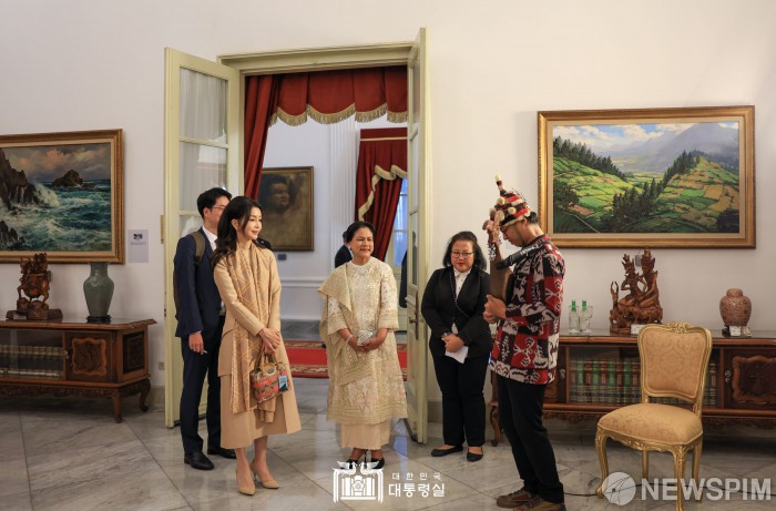 [서울=뉴스핌]윤석열 대통령 부인 김건희 여사가 8일(현지시간) 자카르타 대통령궁에서 조코 위도도 인도네시아 대통령 부인 이리아나 위도도 여사와 악기 연주를 감상하고 있다.[사진=대통령실] 2023.09.08 photo@newspim.com