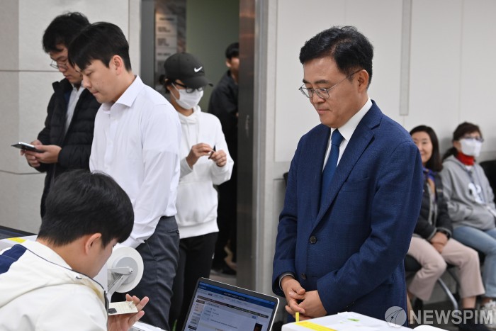 [서울=뉴스핌] 윤창빈 기자 = 진교훈 강서구청장 후보가 6일 오전 서울 강서구 화곡6동 사전투표소에서 투표를 하기 전 본인확인을 하고있다. 2023.10.06 pangbin@newspim.com