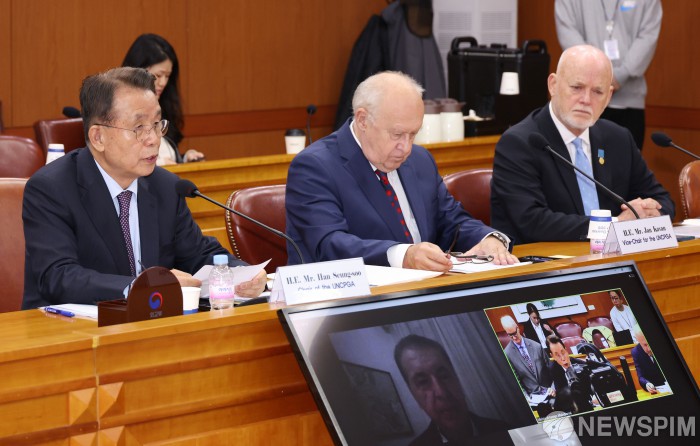[서울=뉴스핌] 김학선 기자 = 19일 서울 종로구 정부서울청사 별관 외교부에서 열린 2023 유엔총회의장협의회(UNCPGA) 전체회의 개회식에서 한승수 의장이 발언하고 있다. 2023.10.19 yooksa@newspim.com