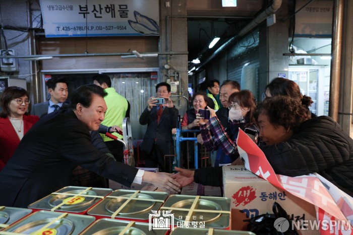 [서울=뉴스핌] 윤석열 대통령이 7일 대구 북구 칠성종합시장을 방문해 상인과 악수하고 있다. [사진=대통령실] 2023.11.07 photo@newspim.com