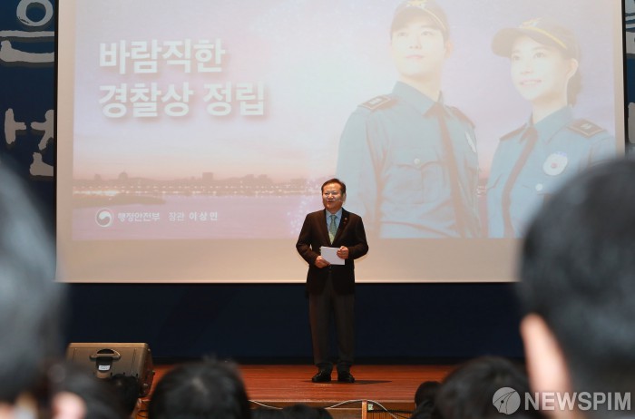 [서울=뉴스핌]이상민 행정안전부 장관이 12일 오전 충북 충주시 소재 중앙경찰학교에서 신임경찰교육생 대상으로 '바람직한 경찰상 정립'을 주제로 특강을 하고 있디.[사진=행정안전부] 2023.12.12 photo@newspim.com